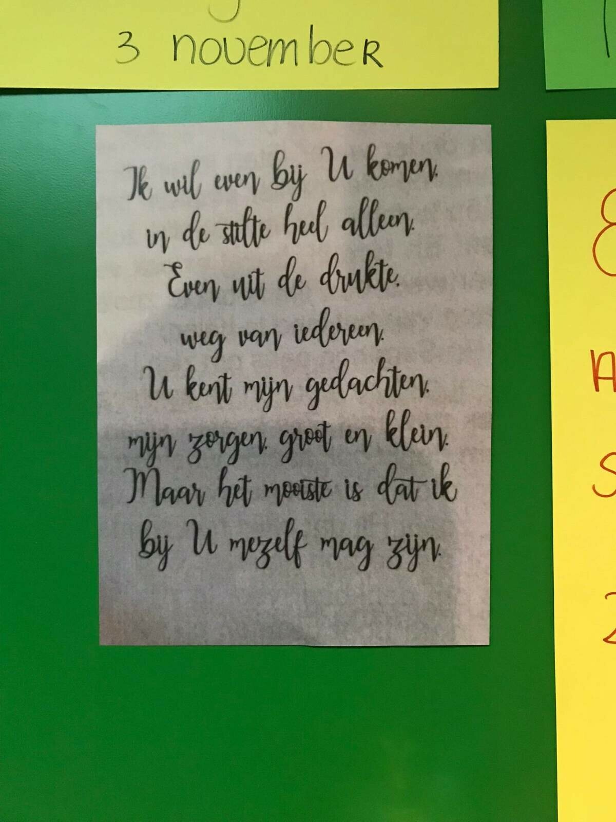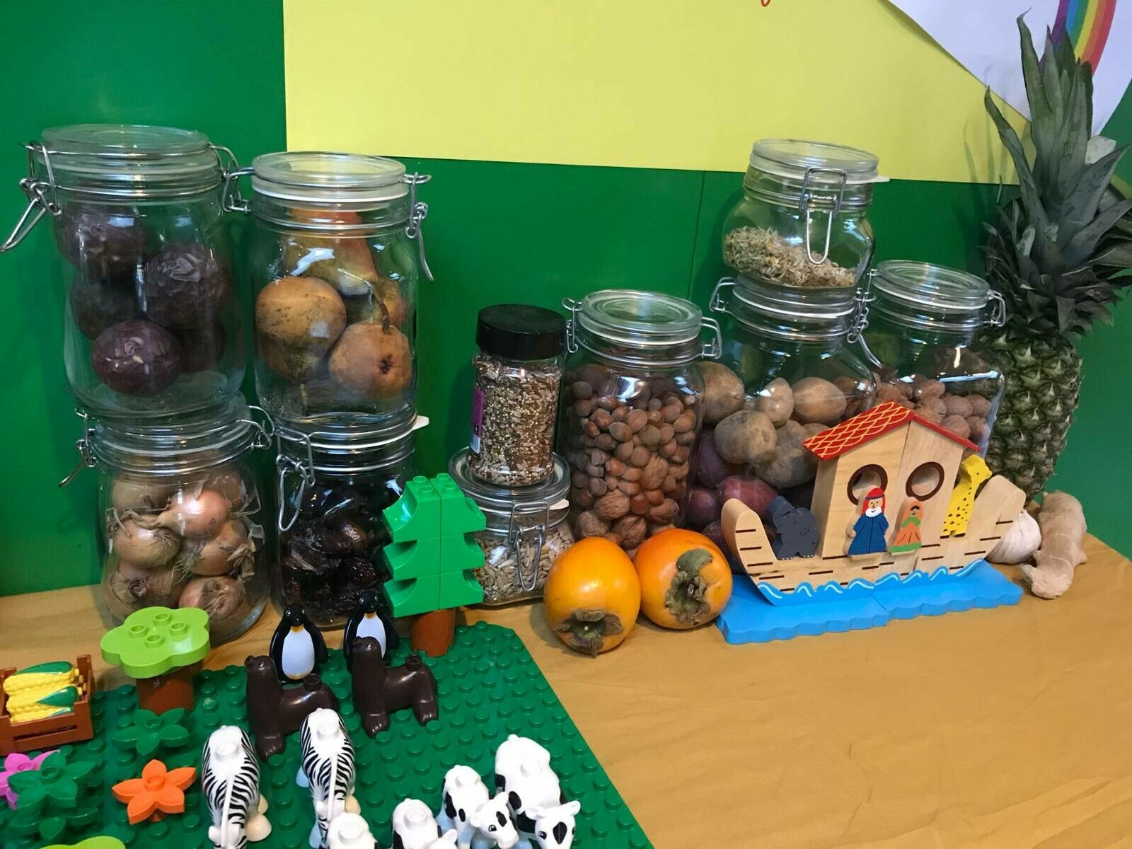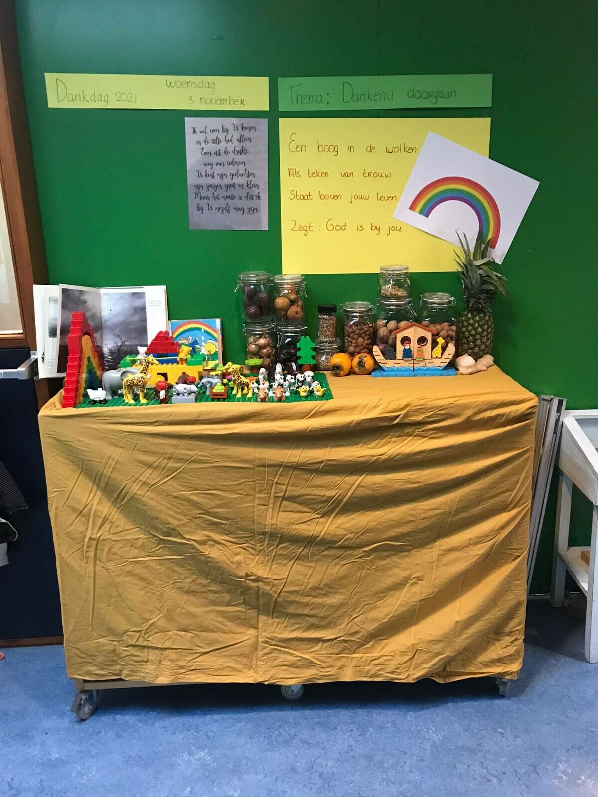 Het is inmiddels al meer dan een week geleden, maar u heeft nog het bericht van Dankdag van ons tegoed. Vorige week en met name vorige week woensdag hebben wij aandacht besteed aan Dankdag. Het thema was dit jaar: dankend doorgaan. Zoals u op de foto's kunt zien gingen de verhalen onder andere over Noach en het verbond van God in de vorm van de regenboog als teken van trouw aan de wereld. De regenboog zagen we dit jaar bij de jaaropening ook al terugkomen. Toen ging het verhaal over het wonderland van Rainbow de duif. Adviesraad weer bedankt voor de prachtige thematafel!