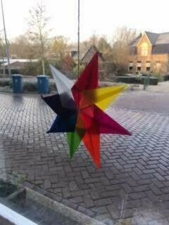 Is het jullie gelukt om de vouwblaadjes om te toveren tot ster? Hangt de ster ( met de flyer) misschien zelfs al voor het raam?