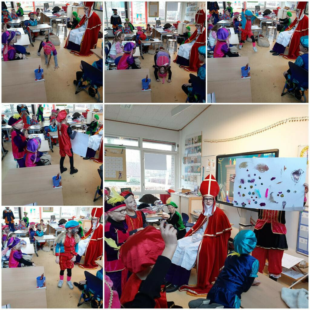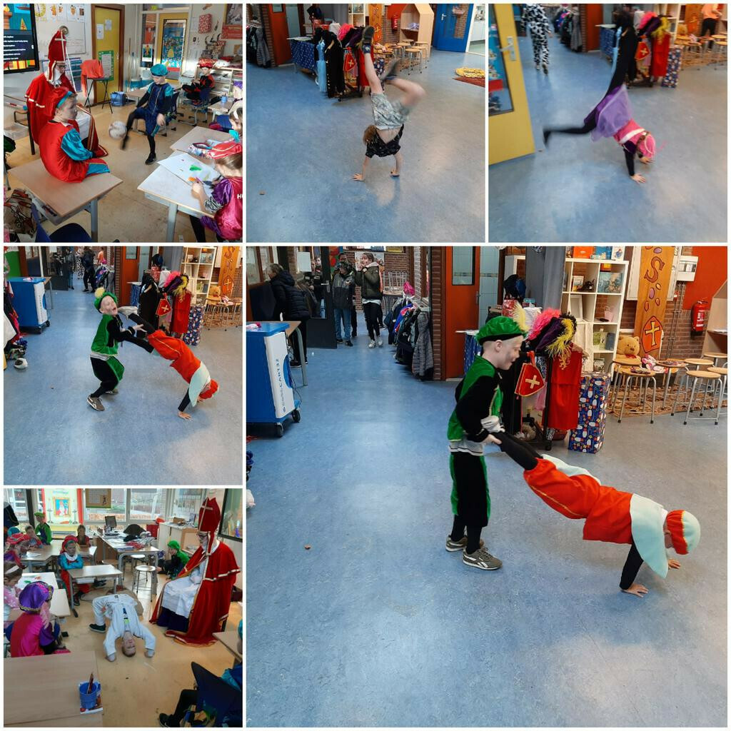 Toen 'Sint' kwam Sint naar groep 3/4 en hebben we onze kunsten laten zien. We moesten daar wel een beetje ruimte maken voor. Toch hebben we sommige kunsten maar even op de gang getoond voor de veiligheid/ ruimte. Ook buiten zijn er nog kunsten vertoond (helaas ontbreekt de foto van de dakpieten Graziano, Mason en Gijs, maar dat was wel echt knap).