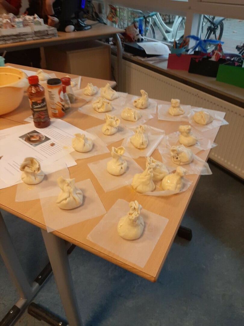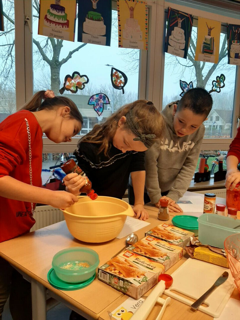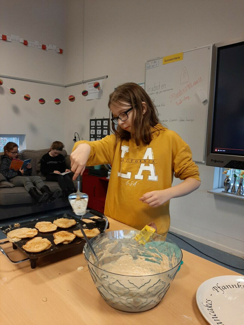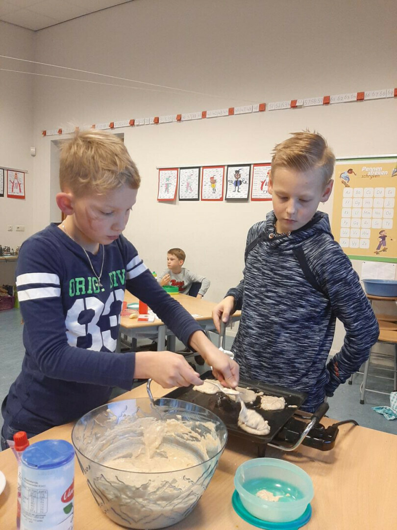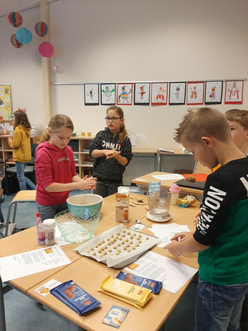 In groepjes hebben ze de recepten gelezen, de ingrediënten afgewogen en de handen vies gemaakt. De moeder van Jasmijn heeft alles voor ons afgebakken, bedankt!