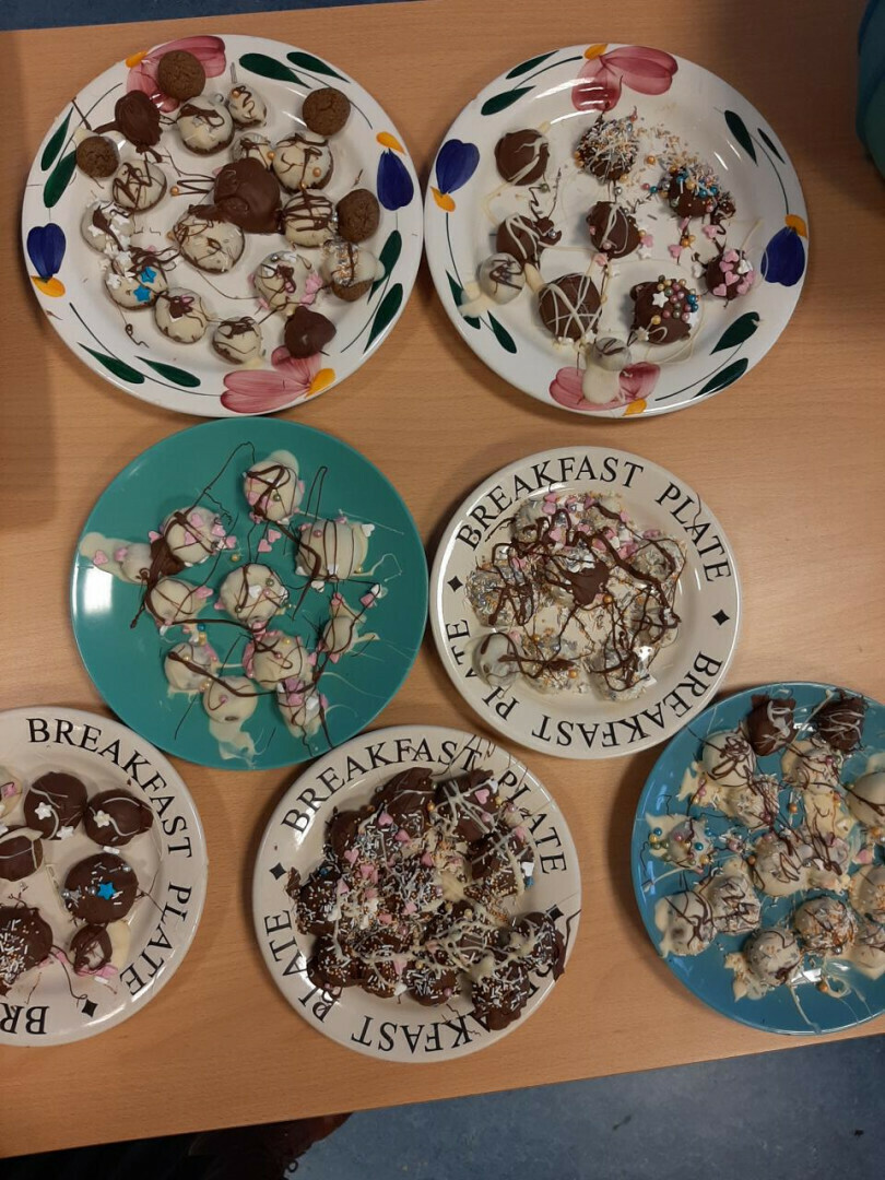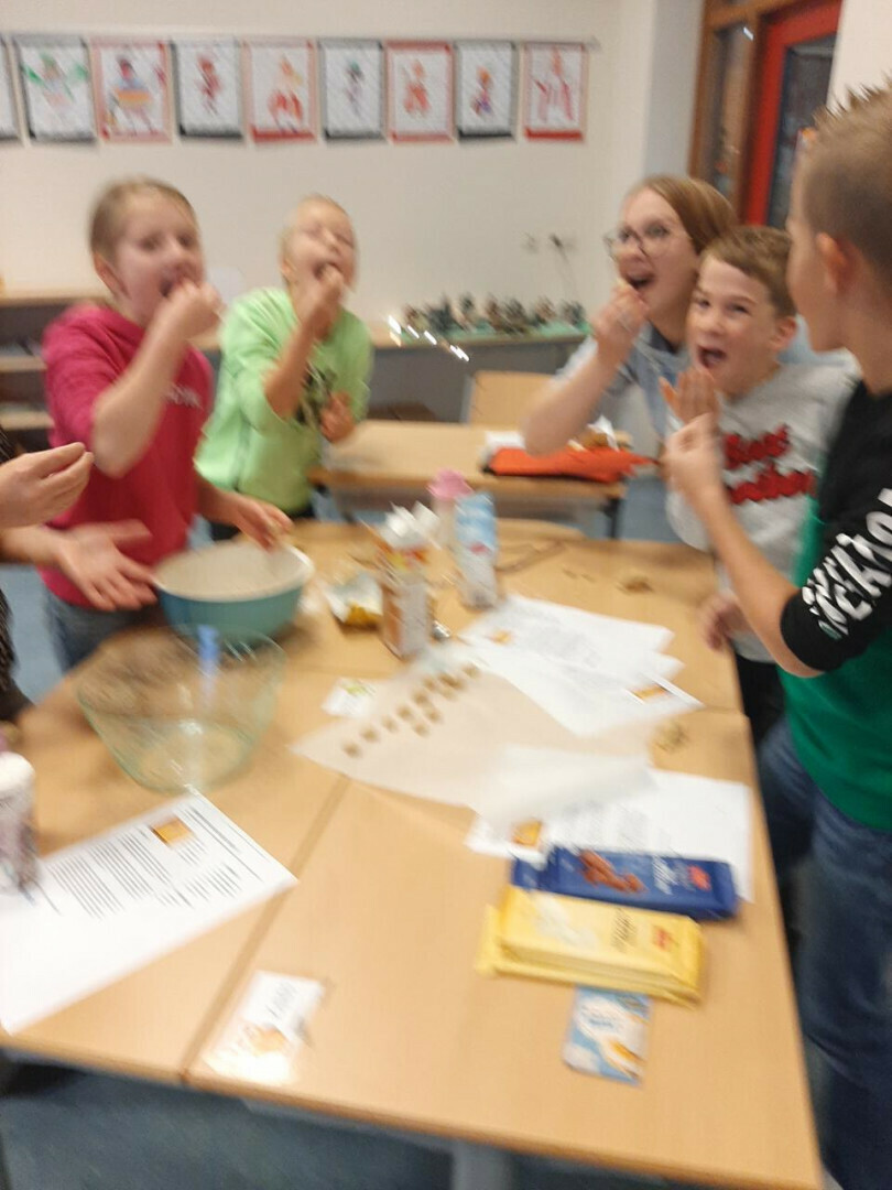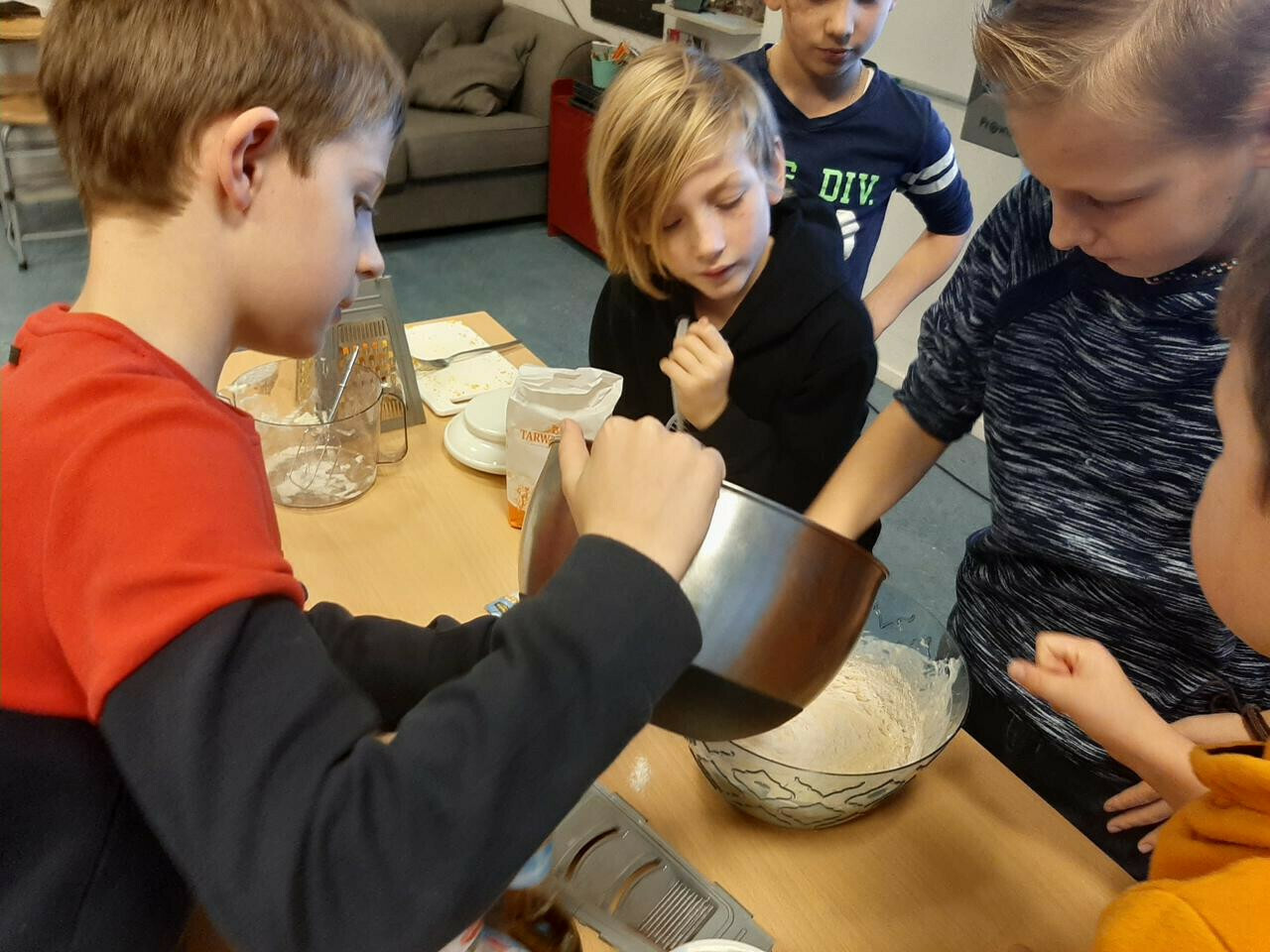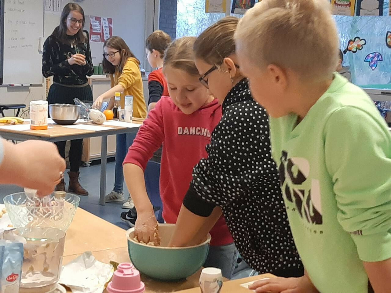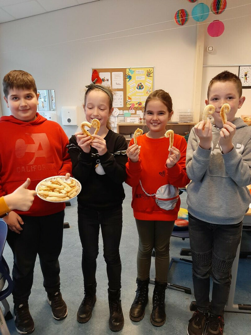In groepjes hebben ze de recepten gelezen, de ingrediënten afgewogen en de handen vies gemaakt. De moeder van Jasmijn heeft alles voor ons afgebakken, bedankt!